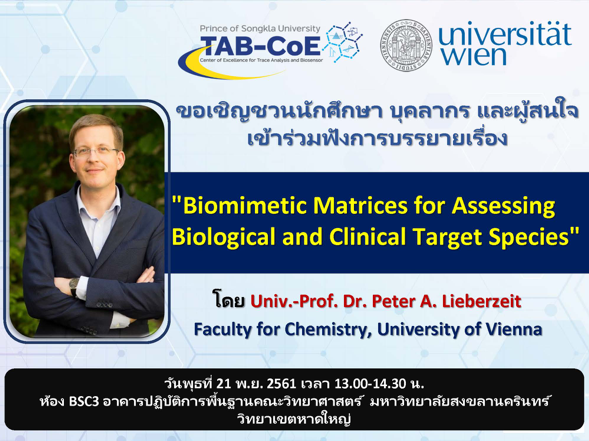 ศูนย์วิจัยความเป็นเลิศด้านการวิเคราะห์สารปริมาณน้อยเเละไบโอเซนเซอร์ (TAB-CoE) คณะวิทยาศาสตร์ ม.อ. ขอเชิญร่วมเข้าฟังสัมมนาในหัวข้อเรื่อง “Biomimetic Matrices for Assessing Biological and Clinical Target Species” โดย Univ.-Prof. Dr. Peter A. Lieberzeit จาก University of Vienna ในวันพุธที่ 21 พฤศจิกายน 2561 เวลา 13.00-14.30 น. ณ ห้อง BSc3 อาคารปฏิบัติการพื้นฐาน คณะวิทยาศาสตร์ มหาวิทยาลัยสงขลานครินทร์