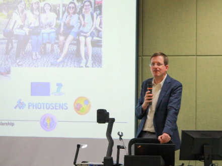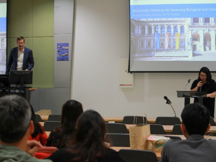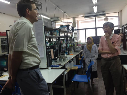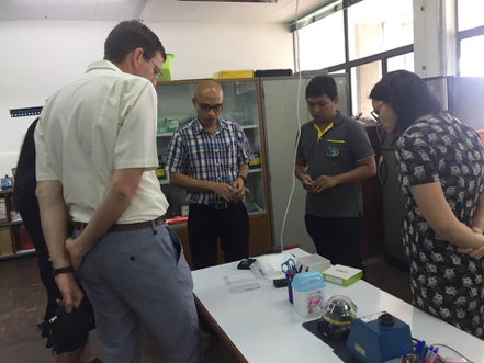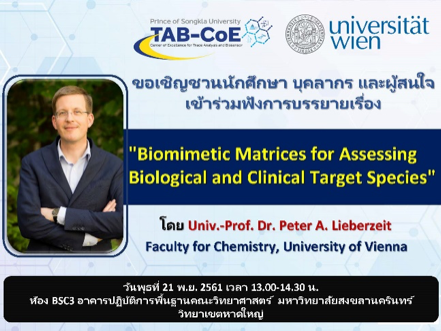 ศูนย์วิจัยความเป็นเลิศด้านการวิเคราะห์สารปริมาณน้อยและไบโอเซนเซอร์ (TAB-CoE) คณะวิทยาศาสตร์ ม.อ. ให้การต้อนรับ Univ.-Prof. Dr. Peter A. Lieberzeit จาก Faculty for Chemistry, University of Vienna ในวันพุธที่ 21 พฤศจิกายน 2561 นำโดย ที่ปรึกษาศูนย์วิจัยความเป็นเลิศฯ รศ.ดร.เพริศพิขญ์ คณาธารณา และ รศ.ดร.ปณต ถาวรังกูร และผู้อำนวยการศูนย์วิจัยความเป็นเลิศฯ ผศ.ดร.จงดี บูรณชัย และคณาจารย์ บุคลากร ศูนย์วิจัยความเป็นเลิศฯ โดยช่วงเช้าเป็นการปรึกษาหารืองานวิจัยและแลกเปลี่ยนความคิดเห็นในงานวิจัย พร้อมเข้าชมห้องปฏิบัติการวิจัยต่าง ๆ ของศูนย์ความเป็นเลิศฯ ณ ห้อง Ch318 ห้อง Ch312 ห้อง P407 และห้อง P400 ซึ่งได้รับความสนใจอย่างดี ช่วงบ่ายเป็นการบรรยายในหัวข้อเรื่อง “Biomimetic Matrices for Assessing Biological and Clinical Target Species” ณ ห้อง BSc3 อาคารปฏิบัติการพื้นฐาน คณะวิทยาศาสตร์ มหาวิทยาลัยสงขลานครินทร์ วิทยาเขตหาดใหญ่
