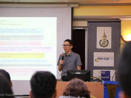 บรรยากาศการบรรยายในกิจกรรม TAB–CoE Research Forum ครั้งที่ 2 ในหัวข้อ “จุดประกายแนวคิดในการทำงานวิจัยสิ่งประดิษฐ์และนวัตกรรม” โดย รศ.ดร.พานิช อินต๊ะ จากหน่วยวิจัยสนามไฟฟ้าประยุกต์ในงานวิศวกรรม (RUEE) วิทยาลัยเทคโนโลยีและสหวิทยาการ มหาวิทยาลัยเทคโนโลยีราชมงคลล้านนา ในวันพุธ ที่ 24 เมษายน 2562 เวลา 13.00–14.30 น. ณ ห้องสัมมนาคณะวิทยาศาสตร์ คณะวิทยาศาสตร์ มหาวิทยาลัยสงขลานครินทร์
