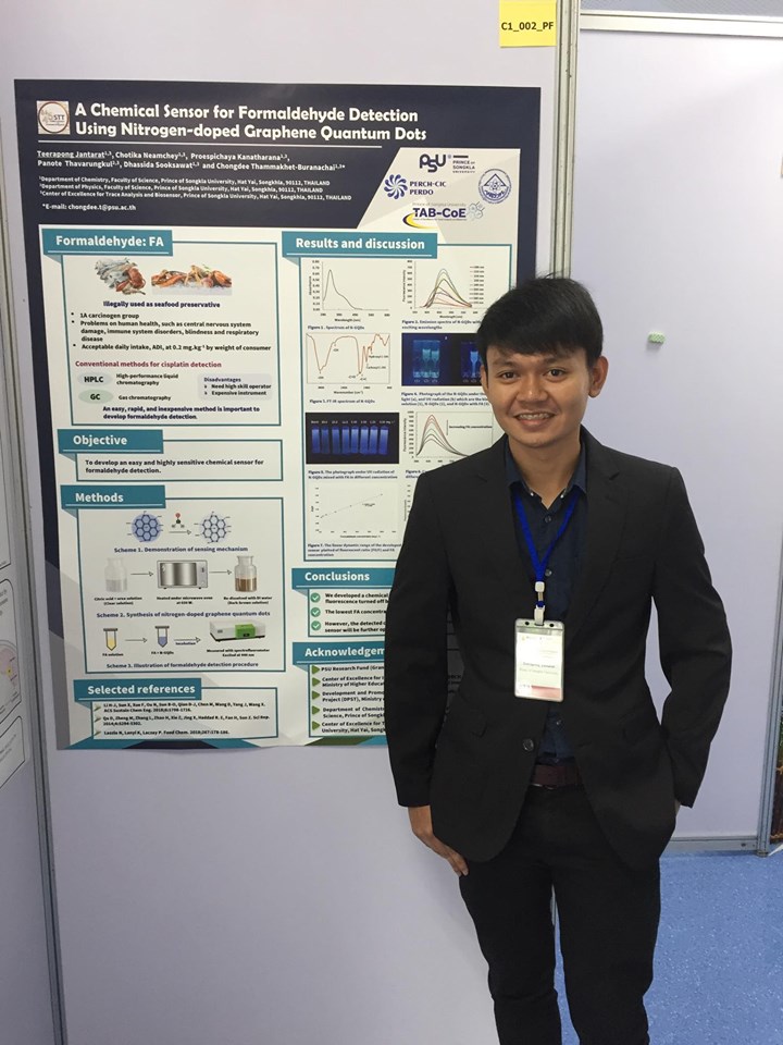 1. นายธีรพงศ์ จันทรัตน์ นำเสนอผลงานแบบโปสเตอร์เรื่อง “A Chemical Sensor for Formaldehyde Detection Using Nitrogen-doped Graphene Quantum Dots” โดยมี ผศ.ดร.จงดี บูรณชัย เป็นอาจารย์ที่ปรึกษา และ ดร.ทรรศิดา สุขสวัสดิ์ รศ.ดร.เพริศพิชญ์ คณาธารณา และ รศ.ดร.ปณต ถาวรังกูร เป็นอาจารย์ที่ปรึกษาร่วม
