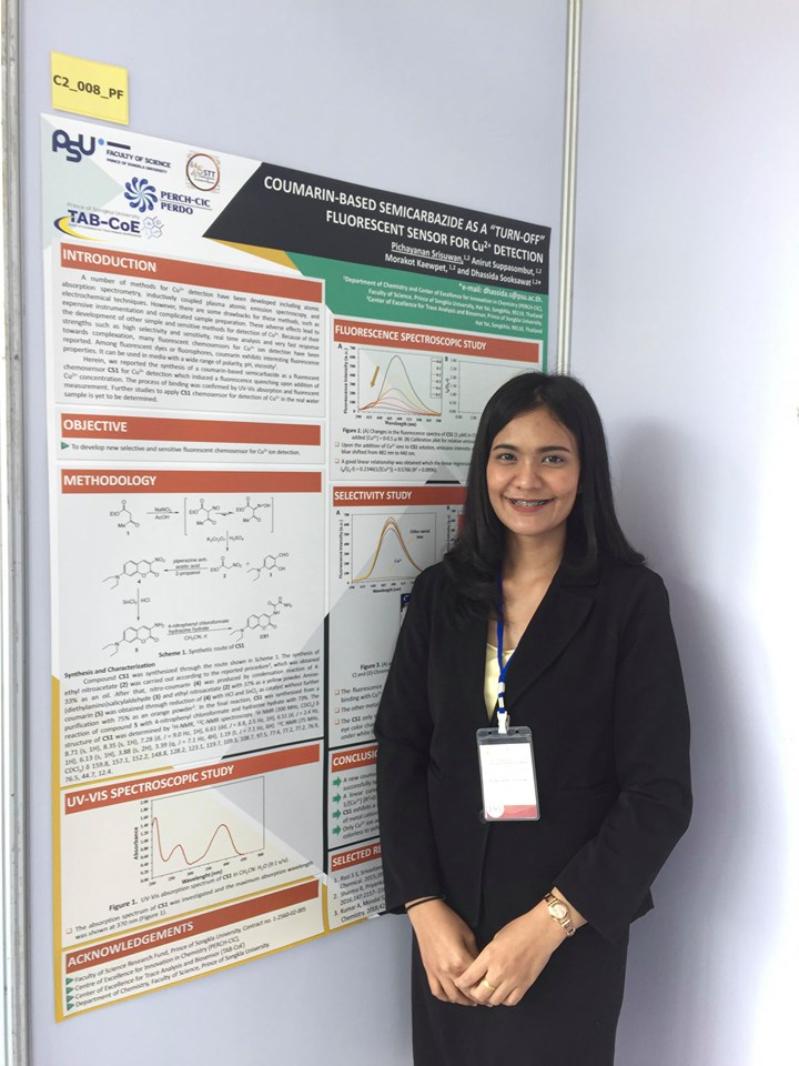 3. นางสาวพิชญานัน ศรีสุวรรณ นำเสนอผลงานแบบโปสเตอร์เรื่อง “Coumarin-based semicarbazide as “turn-off” fluorescent sensor for Cu” โดยมี ดร.ทรรศิดา สุขสวัสดิ์ เป็นอาจารย์ที่ปรึกษา และ ดร. มรกต แก้วเพชร เป็นอาจารย์ที่ปรึกษาร่วม