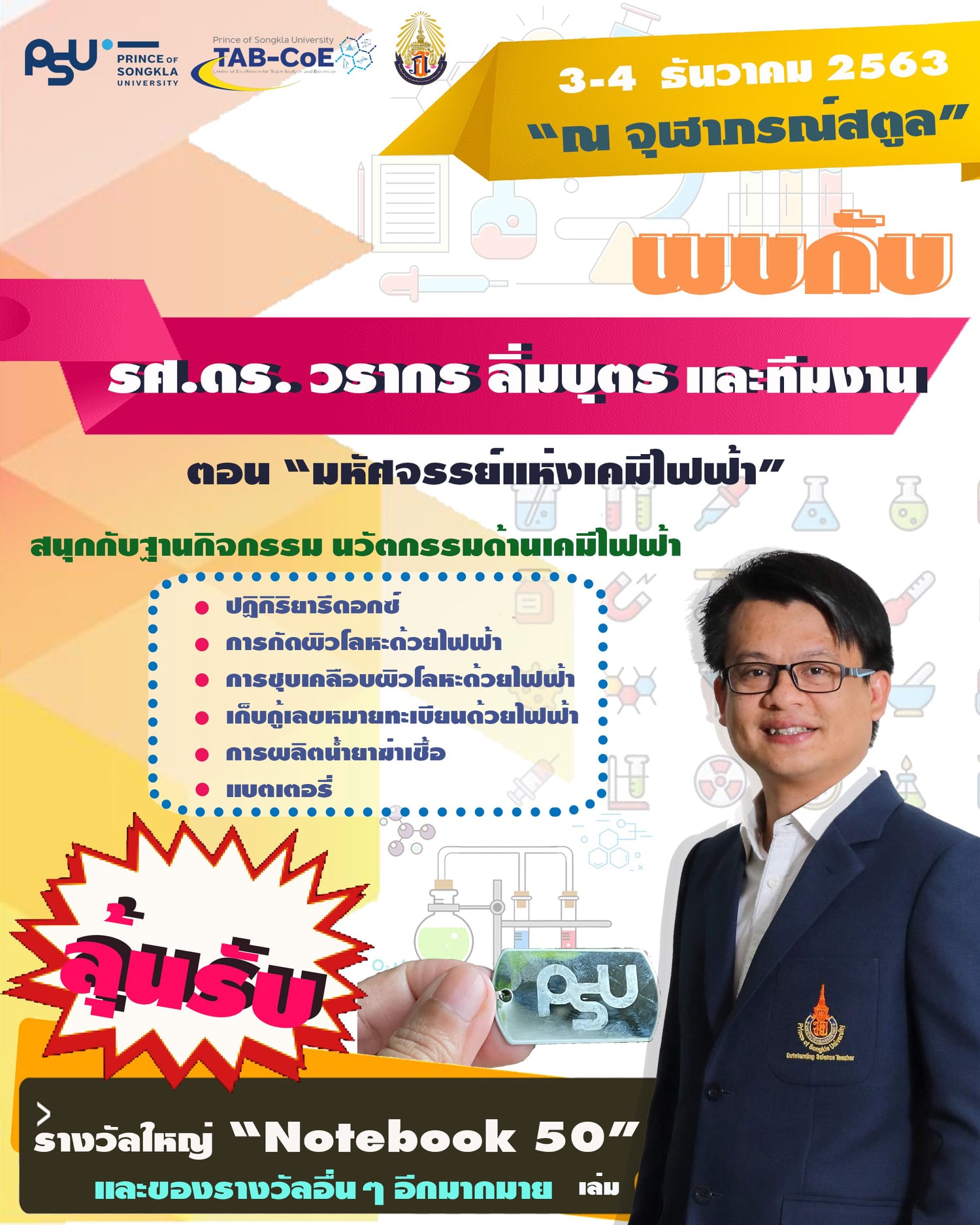 รองศาสตราจารย์ ดร.วรากร ลิ่มบุตร รองผู้อำนวยการศูนย์วิจัยความเป็นเลิศด้านการวิเคราะห์สารปริมาณน้อยและไบโอเซนเซอร์ คณะวิทยาศาสตร์ มหาวิทยาลัยสงขลานครินทร์ ได้รับเกียรติเป็นวิทยากรบรรยายพิเศษ ในหัวข้อ “มหัศจรรย์แห่งเคมีไฟฟ้า” ในวันที่ 4-5 ธันวาคม 2563 ณ โรงเรียนวิทยาศาสตร์จุฬาภรณราชวิทยาลัย สตูล ตำบลฉลุง อำเภอเมืองสตูล จังหวัดสตูล ในการบรรยายครั้งนี้  ได้รับการตอบรับจาก บุคลากรทางการศึกษา อาจารย์ และนักเรียน เป็นอย่างมาก