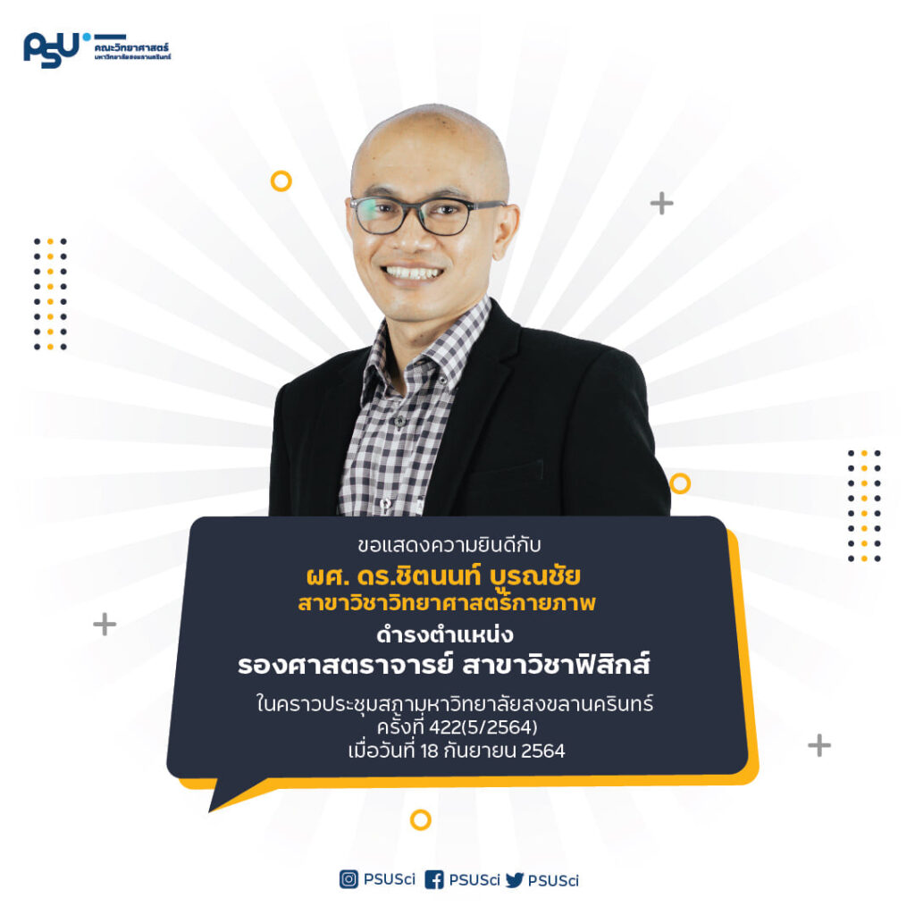 ศูนย์วิจัยความเป็นเลิศด้านการวิเคราะห์สารปริมาณน้อยเเละไบโอเซนเซอร์ (TAB-CoE) คณะวิทยาศาสตร์ ม.อ. ขอแสดงความยินดีกับ ผู้ช่วยศาสตราจารย์ ดร.ชิตนนท์ บูรณชัย (สมาชิกTAB-CoE และอาจารย์ประจำสาขาวิชาวิทยาศาสตร์กายภาพ คณะวิทยาศาสตร์) ที่ได้รับอนุมัติให้ดำรงตำแหน่ง  รองศาสตราจารย์ สาขาวิชาฟิสิกส์ จากที่ประชุมสภามหาวิทยาลัยสงขลานครินทร์  ในคราวประชุมครั้งที่ 422 (5/2564) เมื่อวันที่ 18 กันยายน 2564