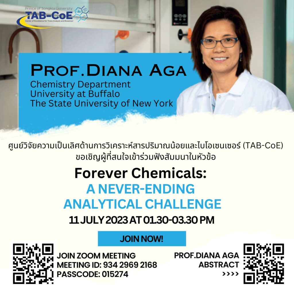 TAB-CoE ขอเชิญผู้สนใจทุกท่านเข้าร่วมฟังสัมมนารูปแบบออนไลน์ ในหัวข้อ “Forever Chemicals: A never-ending Analytical Challenge” โดย Prof. Diana Aga จาก Chemistry Department, University at Buffalo, The State University of New York เป็นวิทยากรผู้บรรยาย วันที่ 11 กรกฎาคม พ.ศ. 2566 เวลา13.30-15.30 น. โดยนักศึกษา บุคลากร และผู้สนใจเข้าร่วมกิจกรรมการบรรยายสามาถเข้าร่วมผ่านทาง Zoom meeting; Meeting ID: 934 2969 2168, Passcode: 015274