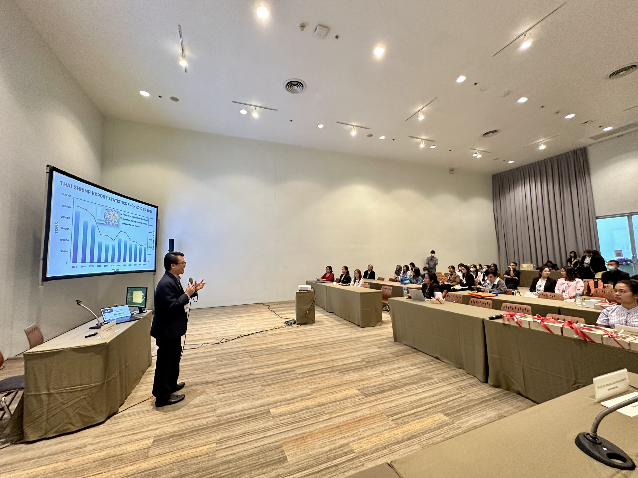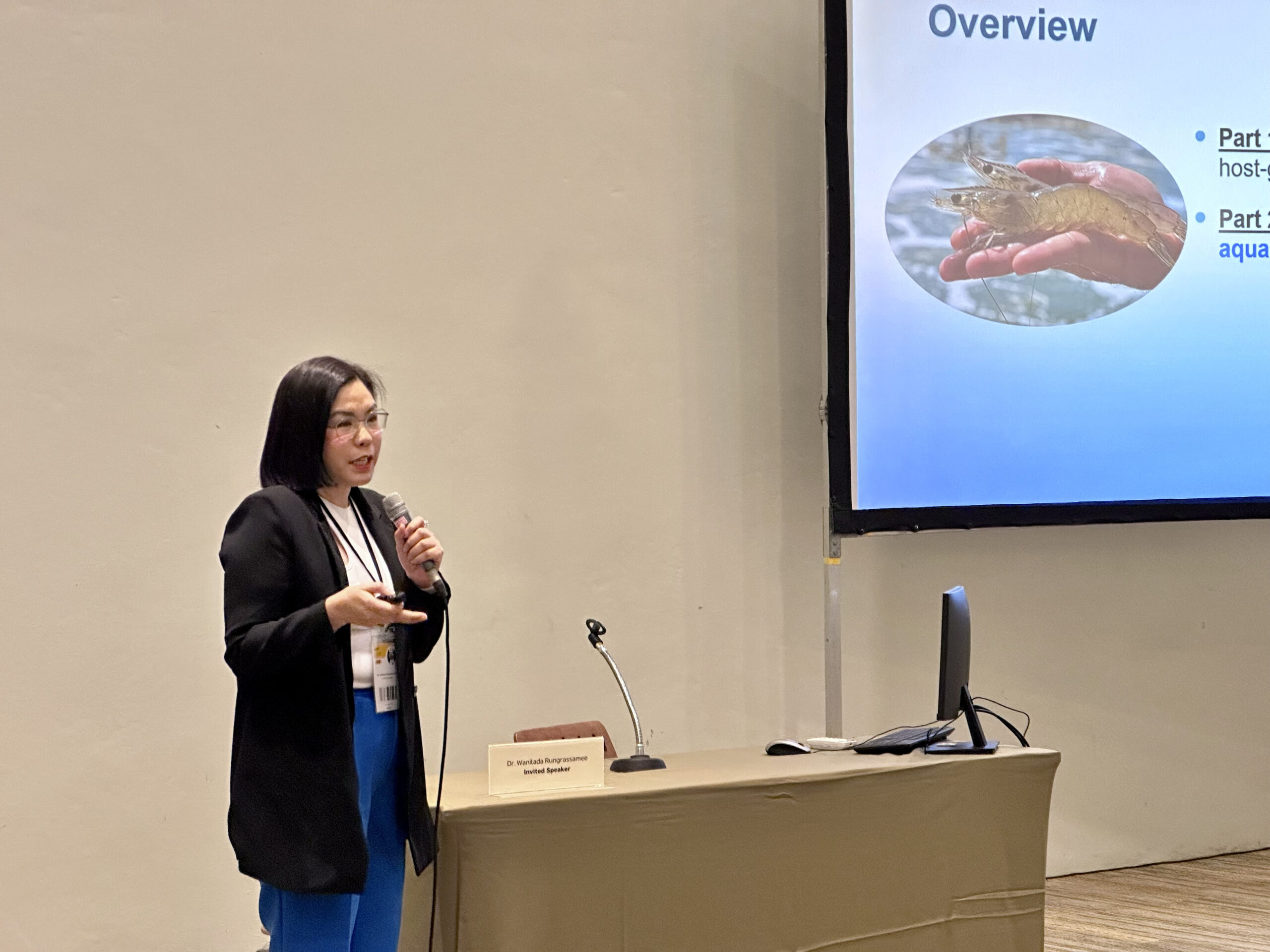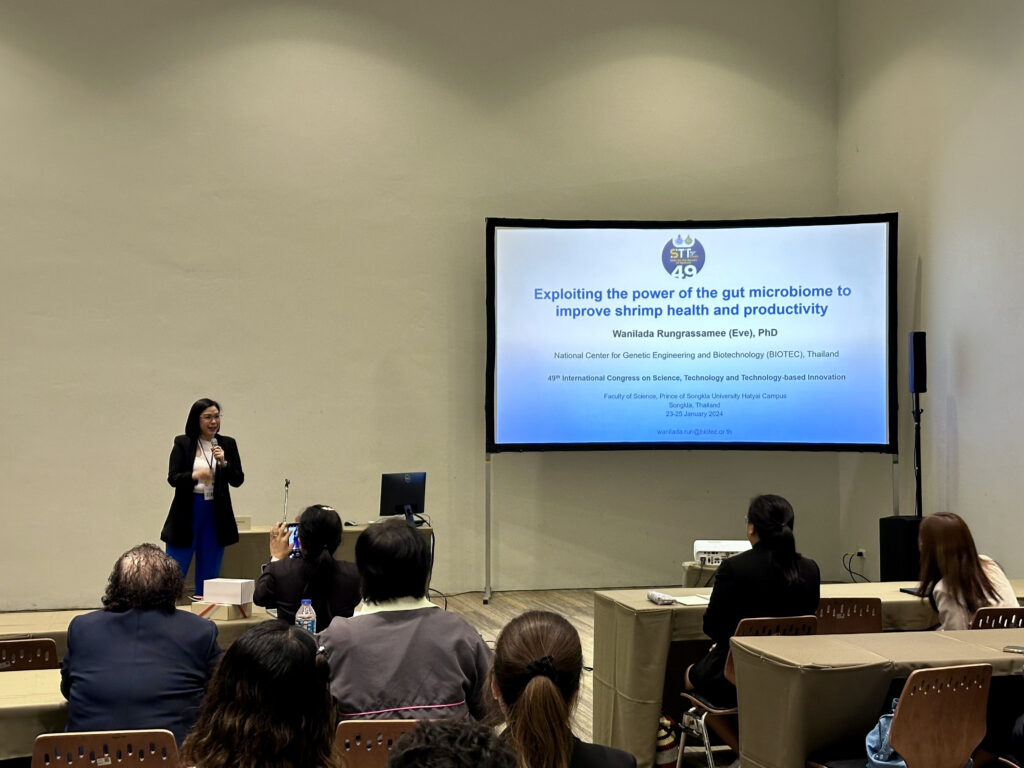 - ดร. วณิลดา รุ่งรัศมี จาก ศูนย์พันธุวิศวกรรมและเทคโนโลยีชีวภาพแห่งชาติ (ไบโอเทค) บรรยายในหัวข้อ “EXPLOITING THE POWER OF THE GUT MICROBIOME TO IMPROVE SHRIMP HEALTH AND PRODUCTIVITY”