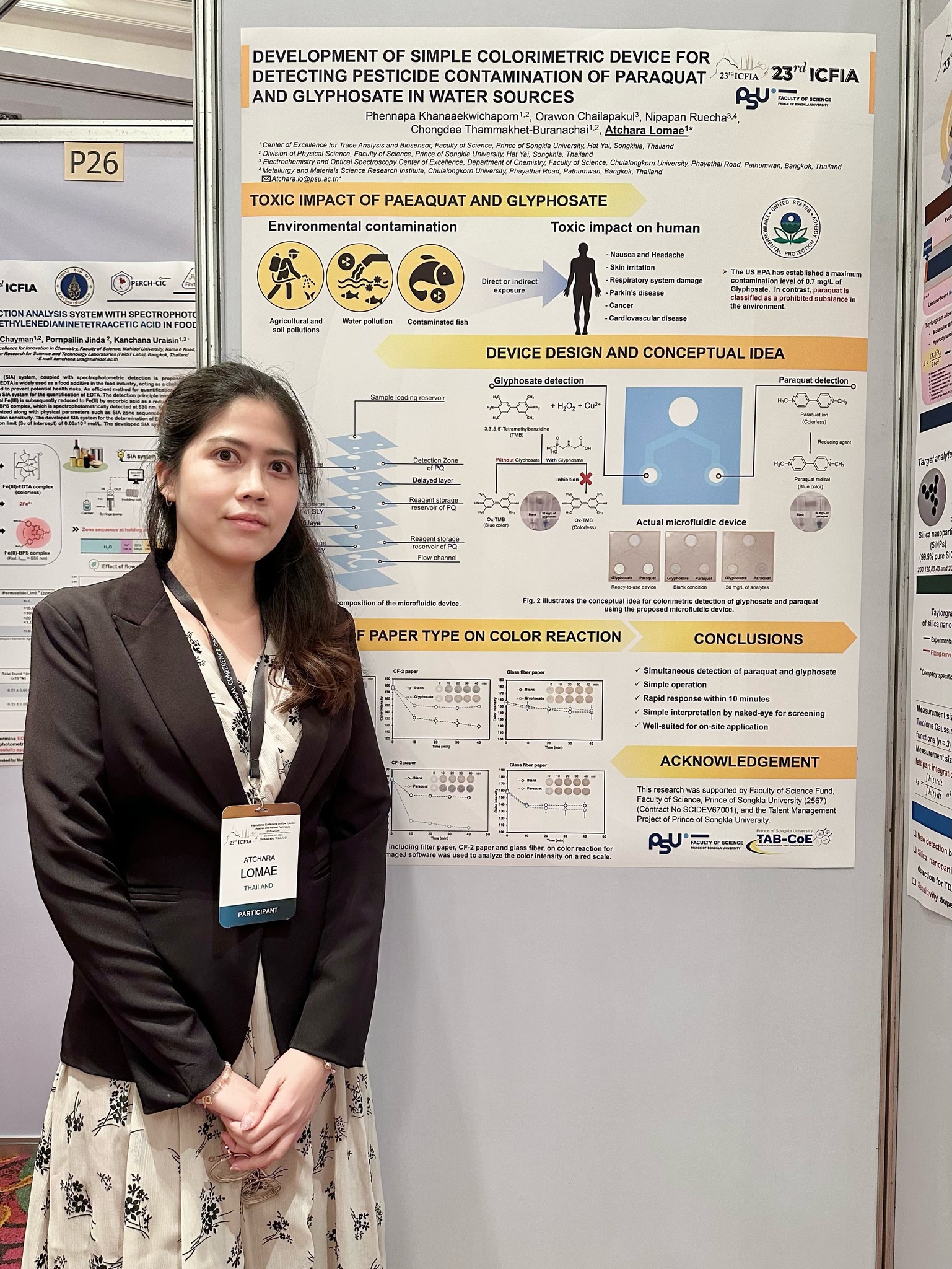 2. งานวิจัยเรื่อง “Development of Simple Colorimetric Device for Detecting Pesticide Contamination of Paraquat and Glyphosate in Water Sources” นำเสนอโดย อ.ดร. อัจฉรา ลอแม