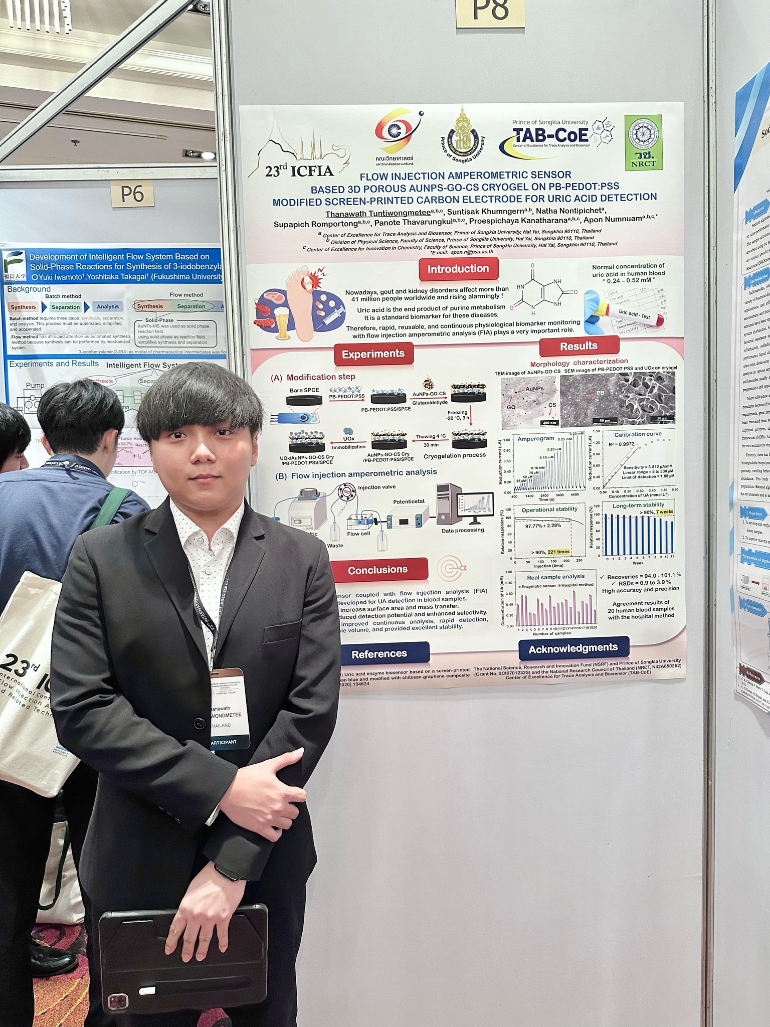 6. งานวิจัยเรื่อง “Flow Injection Amperometric Sensor Based 3D Porous AuNPs-GO-CS Cryogel on PB-PDOT:PSS Modified Screen-Printed Carbon Electrode for Uric Acid Detection” นำเสนอโดย นาย ธนวัฒน์ ตันติวงศ์เมธี