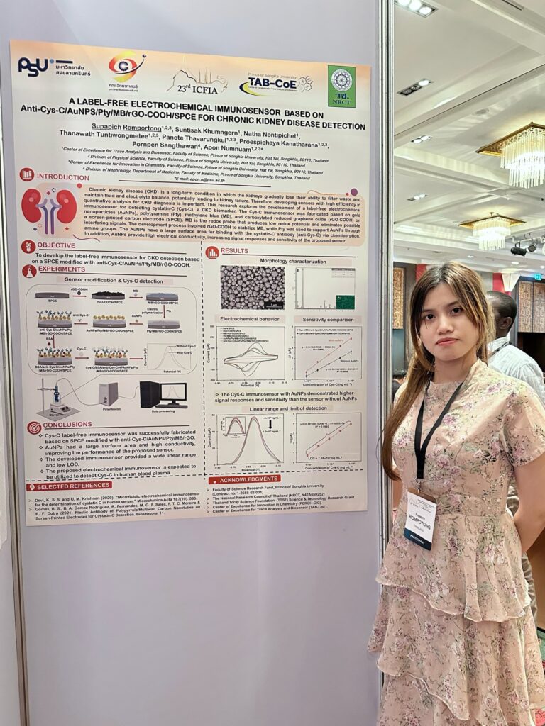 7. งานวิจัยเรื่อง “A Label-Free Electrochemical Immunosensor Based on Anti-Cys-C/AuNPS/Pty/MB/rGO-COOH/SPCE for Chronic Kidney Disease Detection” นำเสนอโดย นางสาว สุภาพิชญ์ ร่มโพธิ์ทอง