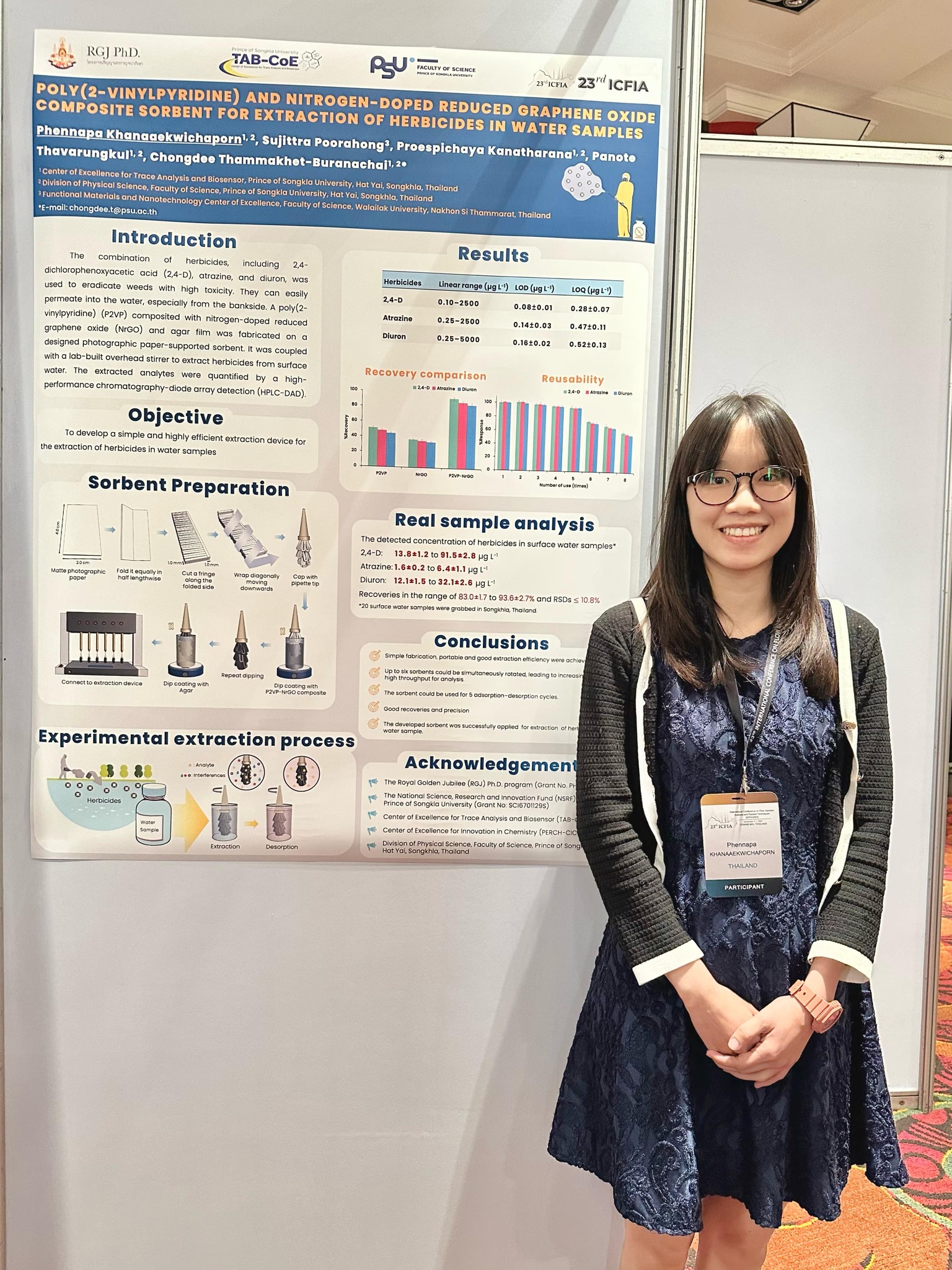 4.งานวิจัยเรื่อง “Poly(2-Vinylpyridine) and Nitrogen-Doped Reduced Graphene Oxide Composite Sorbent for Extraction of Herbicides in Water Sample” นำเสนอโดย ดร. เพ็ญนภา คณาเอกวิชภรณ์