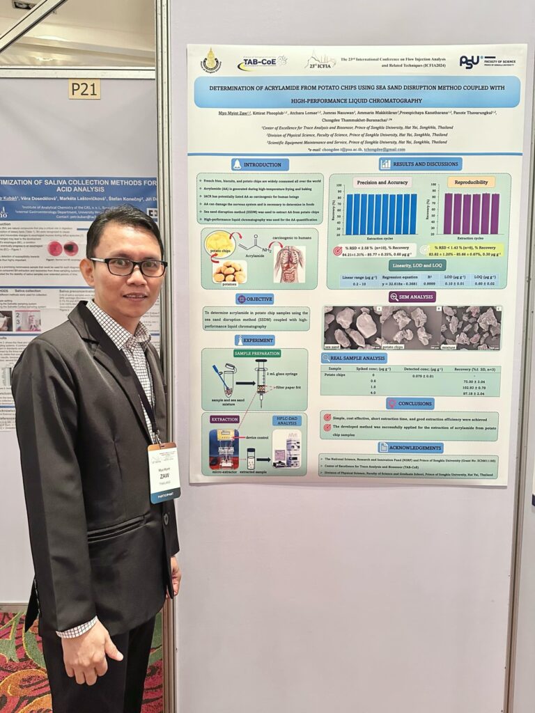 3. งานวิจัยเรื่อง “Determination of Acrylamide from Potato Chips Using Sea Sand Disruption Method Coupled with High-Performance Liquid Chromatography ” นำเสนอโดย ดร. Myo Myint Zaw