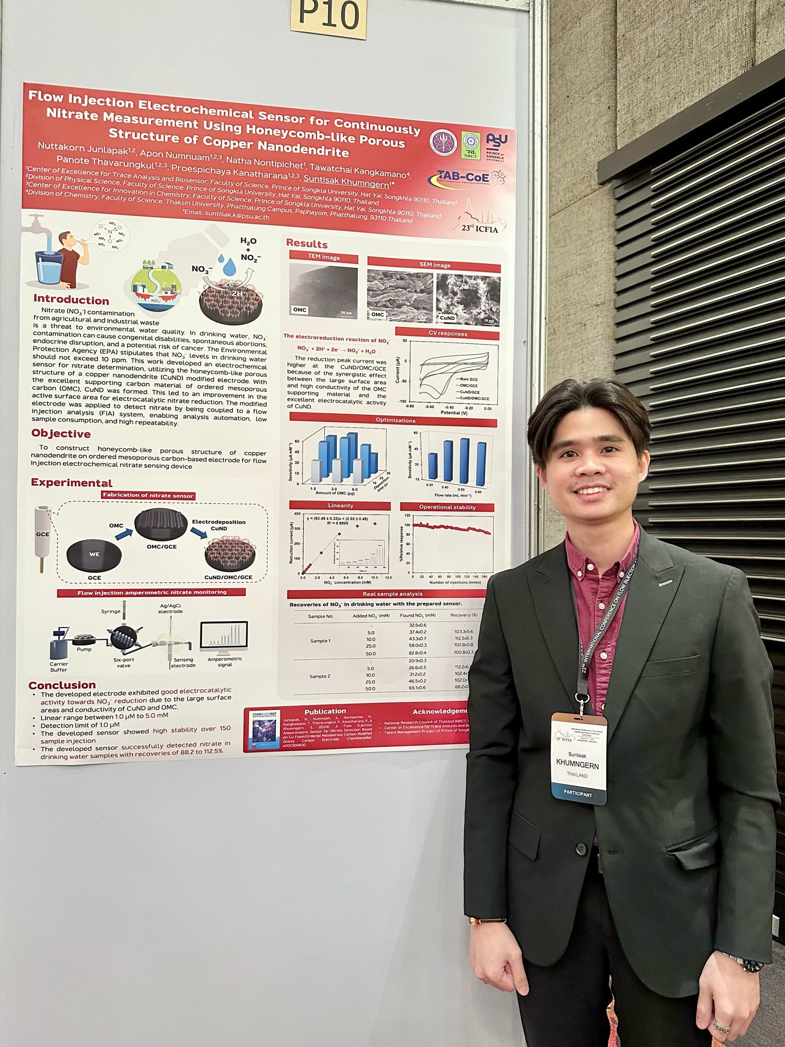 1.งานวิจัยเรื่อง “Flow Injection Electrochemical Sensor for Continuously Nitrate Measurement Using Honeycomb-like Porous Structure of Copper Nanodendrite” นำเสนอโดย อ.ดร. สัณฐิศักดิ์ ขุมเงิน