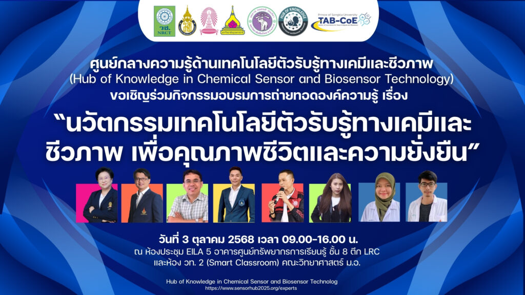 TAB-CoE ขอเชิญเข้าร่วมกิจกรรมอบรมการถ่ายทอดองค์ความรู้ เรื่อง “เทคโนโลยีตัวรับรู้ทางเคมีและชีวภาพ” ซึ่งจัดขึ้นโดยศูนย์วิจัยความเป็นเลิศด้านการวิเคราะห์สารปริมาณน้อยและไบโอเซนเซอร์ คณะวิทยาศาสตร์ มหาวิทยาลัยสงขลานครินทร์ ร่วมกับ ศูนย์กลางความรู้ด้านเทคโนโลยีตัวรับรู้ทางเคมีและชีวภาพ ซึ่งมีคณาจารย์และนักวิจัยชั้นนำเป็นวิทยากรผู้บรรยาย โดยมีวัตถุประสงค์เพื่อให้เกิดการแลกเปลี่ยนความรู้ระหว่างนักวิจัยไทย นักวิชาการ นักวิทยาศาสตร์ คณาจารย์ นักศึกษา เกิดความคิดและมุมมอง ใหม่ ๆ ในการทำวิจัยหรือการต่อยอดผลงานวิจัยไปสู่การใช้ประโยชน์