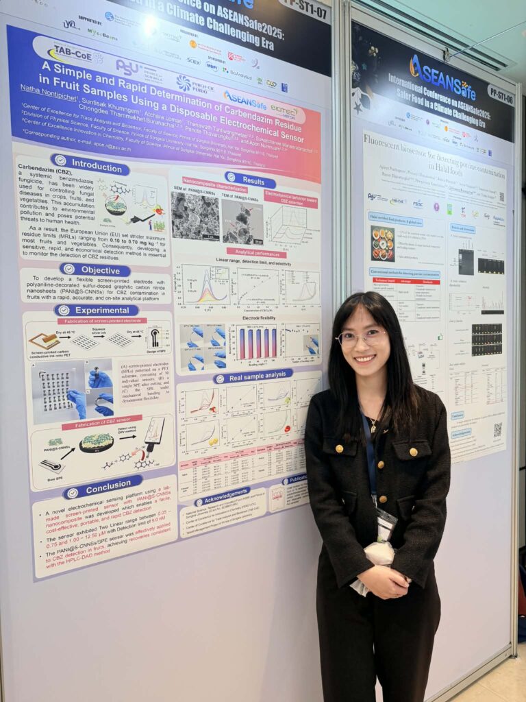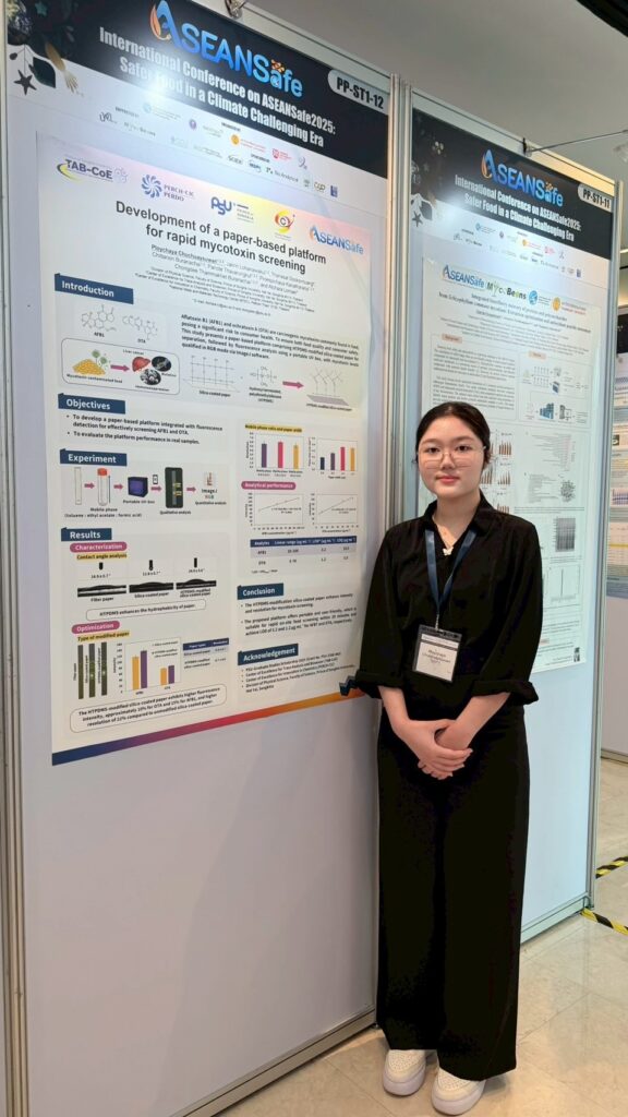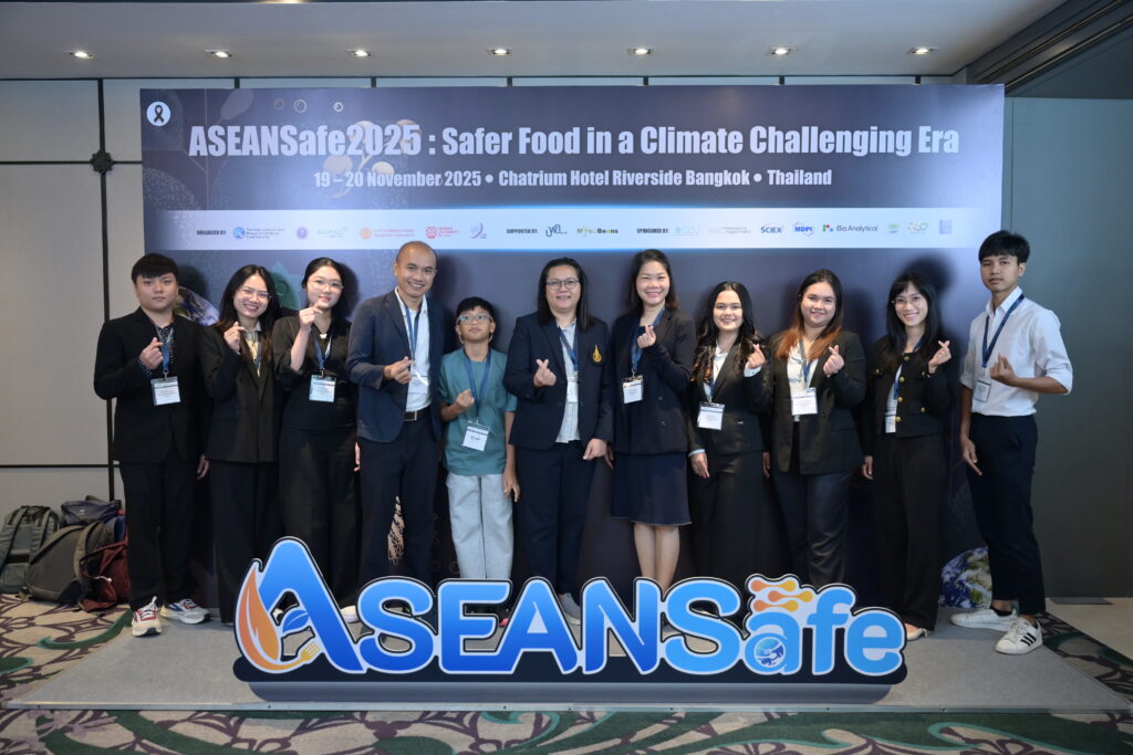 รศ. ดร.จงดี บูรณชัย นำทีมคณาจารย์และนักศึกษาจาก TAB-CoE เข้าร่วมนำเสนอผลงานวิจัยแบบโปสเตอร์ (poster) และปากเปล่า (oral) ในงานประชุมวิชาการระดับนานาชาติในงาน ASEANSafe 2025: Safer Food in a Climate Challenging Era เวทีระดับนานาชาติสำหรับผู้ที่ทำงานด้าน food safety โดยมีการบรรยายพิเศษเกี่ยวกับความเสี่ยงใหม่ของความปลอดภัยอาหาร, การสร้างเครือข่ายตรวจสอบความแท้ของอาหารและสนับสนุนนโยบายเพื่อประเทศกำลังพัฒนา โดยผู้เชี่ยวชาญระดับโลกจาก UK, Italy, Belgium และ Hong Kong งานจัดขึ้นระหว่างวันที่ 19-20 พฤศจิกายน 2568 ณ โรงแรมชาเทรียม ริเวอร์ไซด์ กรุงเทพมหานคร โดยมีงานวิจัยที่เข้าร่วมนำเสนอ มีดังนี้