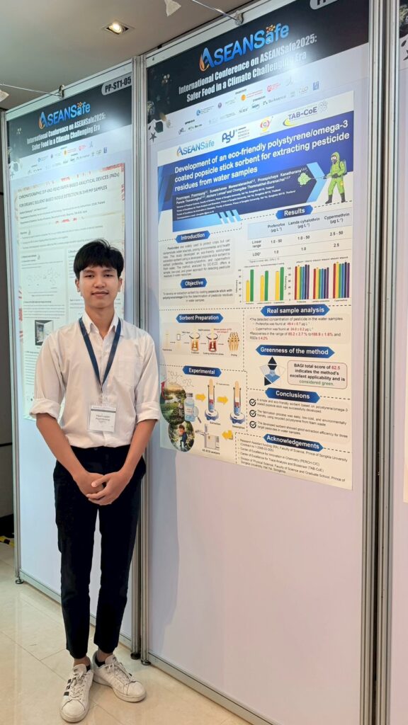 9.งานวิจัยเรื่อง “Development of an eco-friendly polystyrene/omega-3 coated popsicle stick sorbent for extracting pesticide residues from water samples” นำเสนอโดย นายภูมิรพี ปานเมือง