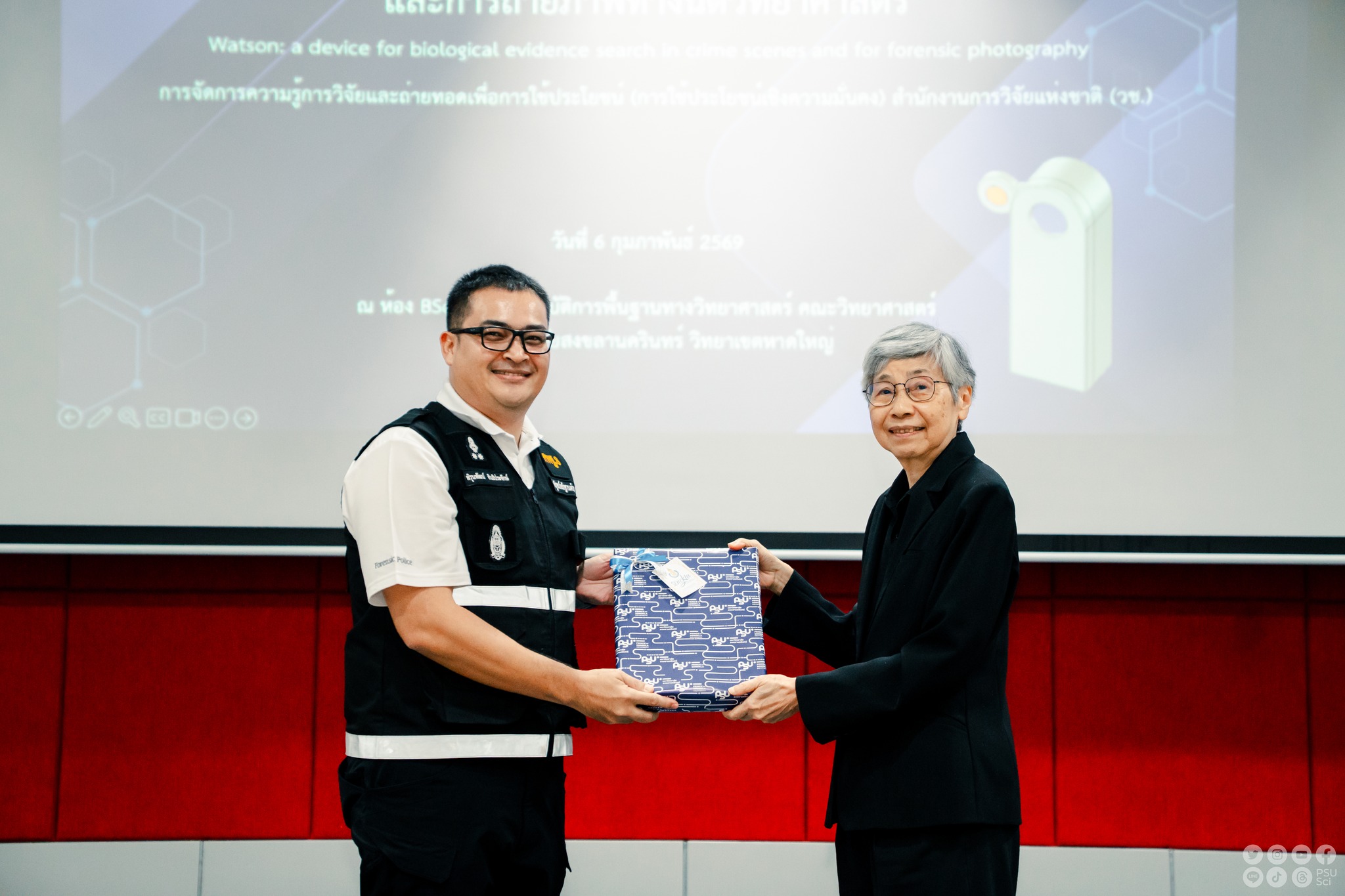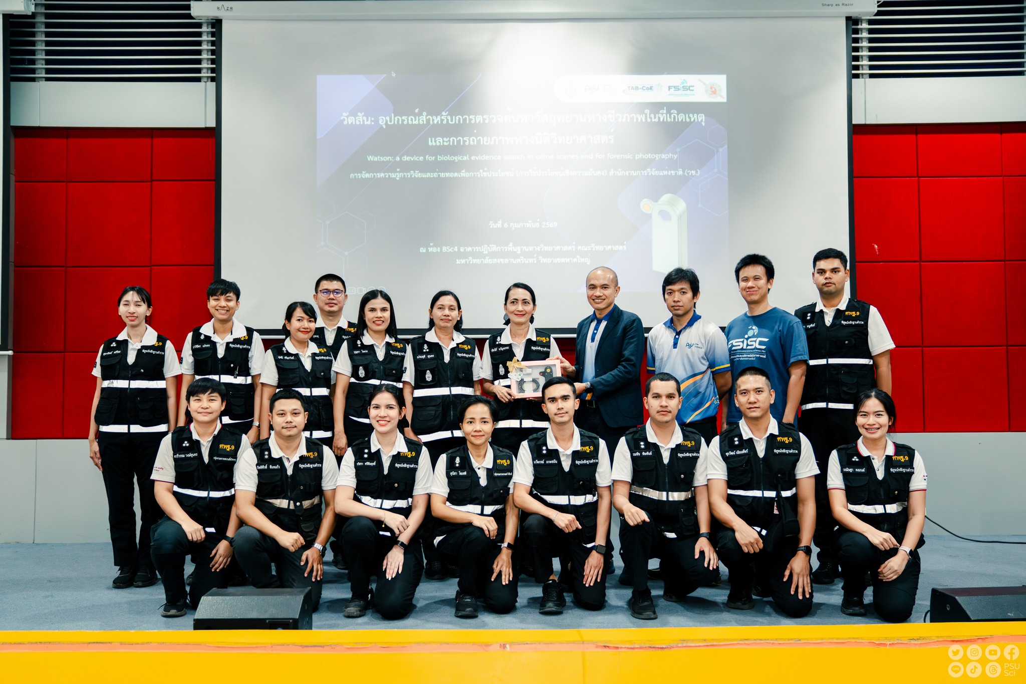 เมื่อวันที่ 6 กุมภาพันธ์ 2569 ที่ผ่านมา ศูนย์วิจัยความเป็นเลิศด้านการวิเคราะห์สารปริมาณน้อยและไบโอเซนเซอร์ (Center of Excellence for Trace Analysis and Biosensor: TAB-CoE) ร่วมกับศูนย์นวัตกรรมและบริการนิติวิทยาศาสตร์ คณะวิทยาศาสตร์ มหาวิทยาลัยสงขลานครินทร์ จัดกิจกรรมถ่ายทอดองค์ความรู้ด้านนิติวิทยาศาสตร์ เรื่อง “วัตสัน: อุปกรณ์สำหรับการตรวจค้นหาวัตถุพยานทางชีวภาพในที่เกิดเหตุและการถ่ายภาพทางนิติวิทยาศาสตร์” ณ ห้อง BSc4 อาคารปฏิบัติการพื้นฐานทางวิทยาศาสตร์ (BSc) คณะวิทยาศาสตร์ มหาวิทยาลัยสงขลานครินทร์ วิทยาเขตหาดใหญ่ โดยได้รับเกียรติจาก รองศาสตราจารย์ ดร.พิมลศรี มิตรภาพอาทร         รองคณบดีฝ่ายวิชาการ การศึกษา และวิเทศสัมพันธ์ และ รองศาสตราจารย์ ดร.ชิตนนท์ บูรณชัย , อ.ดร.กิตติรัตน์ ภู่พลับ, อ.ดร.สัณฐิศักดิ์ ขุมเงิน, อ.ดร.อัจฉรา ลอแม โดยมี ศ.ดร.ปณต ถาวรังกูร ที่ปรึกษา เป็นผู้มอบของที่ระลึกในกิจกรรมครั้งนี้ และทีมงานให้การต้อนรับศูนย์พิสูจน์หลักฐาน 8 , 9 และ 10 และพิสูจน์หลักฐานจังหวัดในสังกัด ร่วมกิจกรรมอย่างอบอุ่น กิจกรรมดังกล่าวประกอบด้วยการบรรยายเชิงวิชาการ การถ่ายทอดประสบการณ์จริงด้านการตรวจพิสูจน์หลักฐานทางชีวภาพ การใช้อุปกรณ์และเทคโนโลยีทางนิติวิทยาศาสตร์ รวมถึงการฝึกปฏิบัติการถ่ายภาพในที่เกิดเหตุ เพื่อเสริมสร้างความรู้ ความเข้าใจ และทักษะเชิงปฏิบัติแก่บุคลากรและผู้เข้าร่วม อันเป็นการยกระดับศักยภาพด้านการวิจัย การบริการวิชาการ และการพัฒนางานด้านวิทยาศาสตร์เพื่อสังคมอย่างยั่งยืน