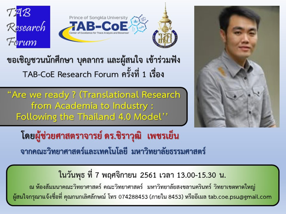 TAB-CoE would like to invite you to join us in the TAB-CoE Research Forum #1 entitled “Are we ready? (Translational Research from Academia to Industry: Following the Thailand 4.0 Model” by Asst. Prof. Dr. Chiravoot Pechyen from the Department of Materials and Textile Technology, Faculty of Science and Technology, Thammasat University on Wednesday 7 November 2018 from 13:00 – 15:30 at the Faculty of Science Seminar room. Registration can be made by phone at 074-288453 or by e-mail at tab.research.forum@gmail.com