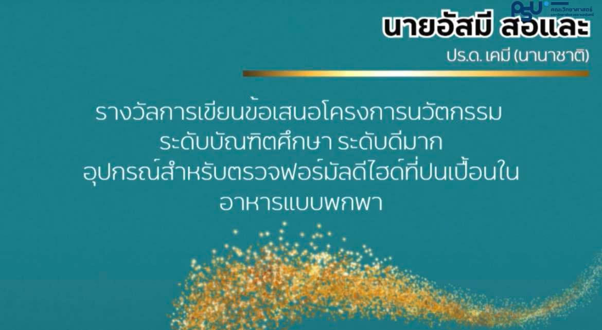 1. Mr. Asamee Soleh, Ph.D. student in Chemistry (international program), received the outstanding Award for writing proposals for innovations in Graduate level 2022 the work entitled “A portable sensor device for the detection of formaldehyde contamination in food”