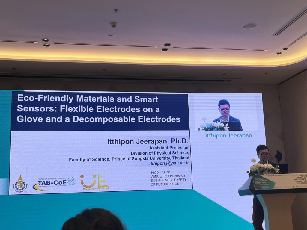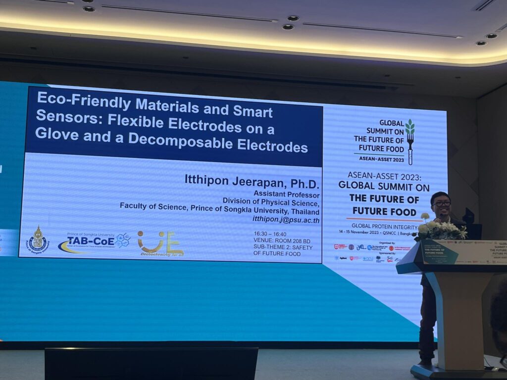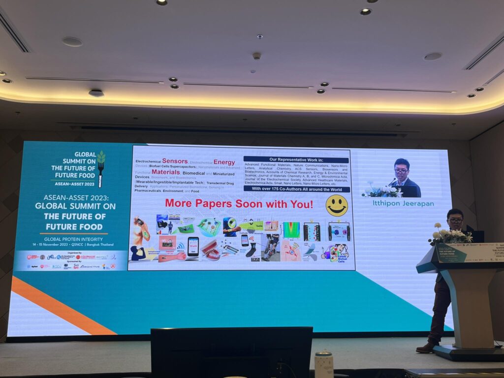 Asst. Prof. Dr. Itthipon Jeerapan, a lecturer from the Division of Physical Science and TAB-CoE member, is invited to give a oral presentation in Sub-theme 2: Safety of future food entitled of “Eco-Friendly Materials and Smart Sensors: Flexible Electrodes on a Glove and a Decomposable Electrodes” at ASEAN-ASSET 2023: Global Summit on the Future of Future Food (ASEAN-ASSET 2023). This conference was held on November 14-15th, 2023, at Queen Sirikit National Convention Center (QSNCC), Bangkok, Thailand.
