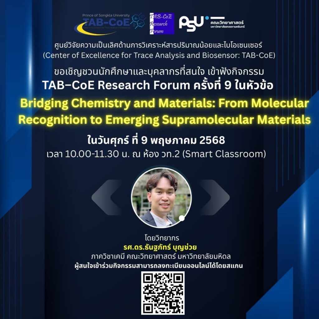 TAB-CoE cordially invites you to attend the TAB-CoE Research Forum #9, titled “Bridging Chemistry and Materials: From Molecular Recognition to Emerging Supramolecular Materials.” The seminar will be presented by Associate Professor Dr. Thanthapatra Bunchuay from the Department of Chemistry, Faculty of Science, Mahidol University.