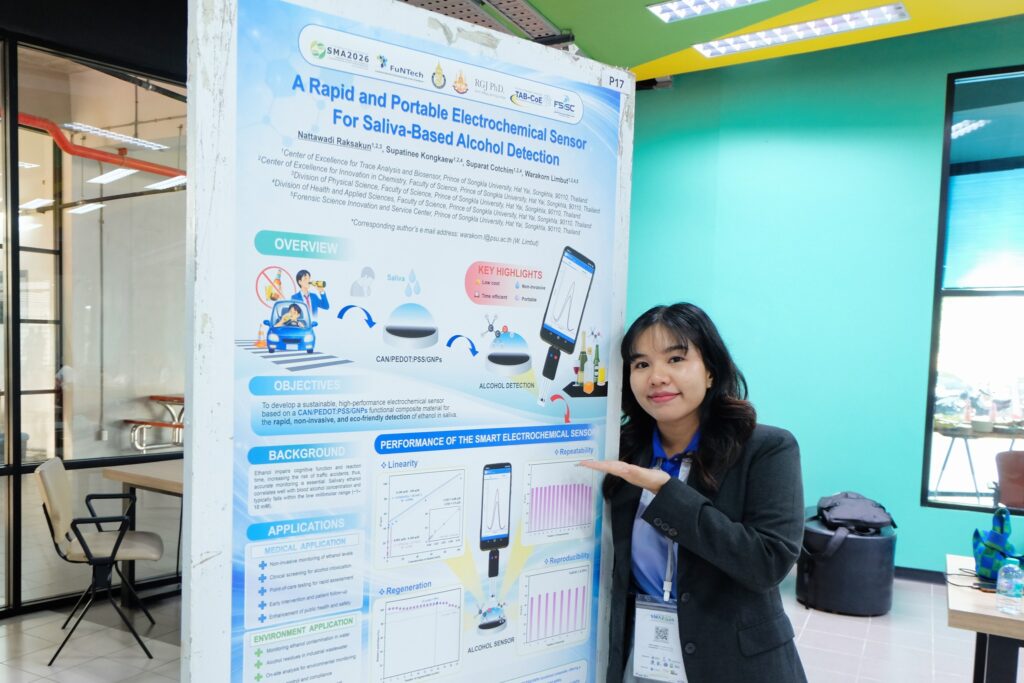 - “A Rapid and Portable Electrochemical Sensor for Saliva-Based Alcohol Detection,” presented by Ms. Nattawai Raksakun, a Ph.D. student under the Royal Golden Jubilee Ph.D. Program (RGJ) in Analytical Chemistry, under the supervision of Prof. Dr. Warakorn Limbut.